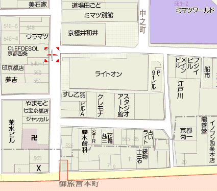 この地図では、一番下の通りが四条通りです。